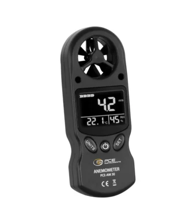 PCE-MAM 2 Mini Anemometer is a lightweight portable handheld pocket-sized wind speed meter or air velocity measuring device / Displays velocity measurements in 5 different units (selectable) / Maximum and minimum functions / Also measures temperature.